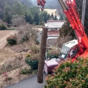 ■斜面での伐採とウッドチッパーによる粉砕処理